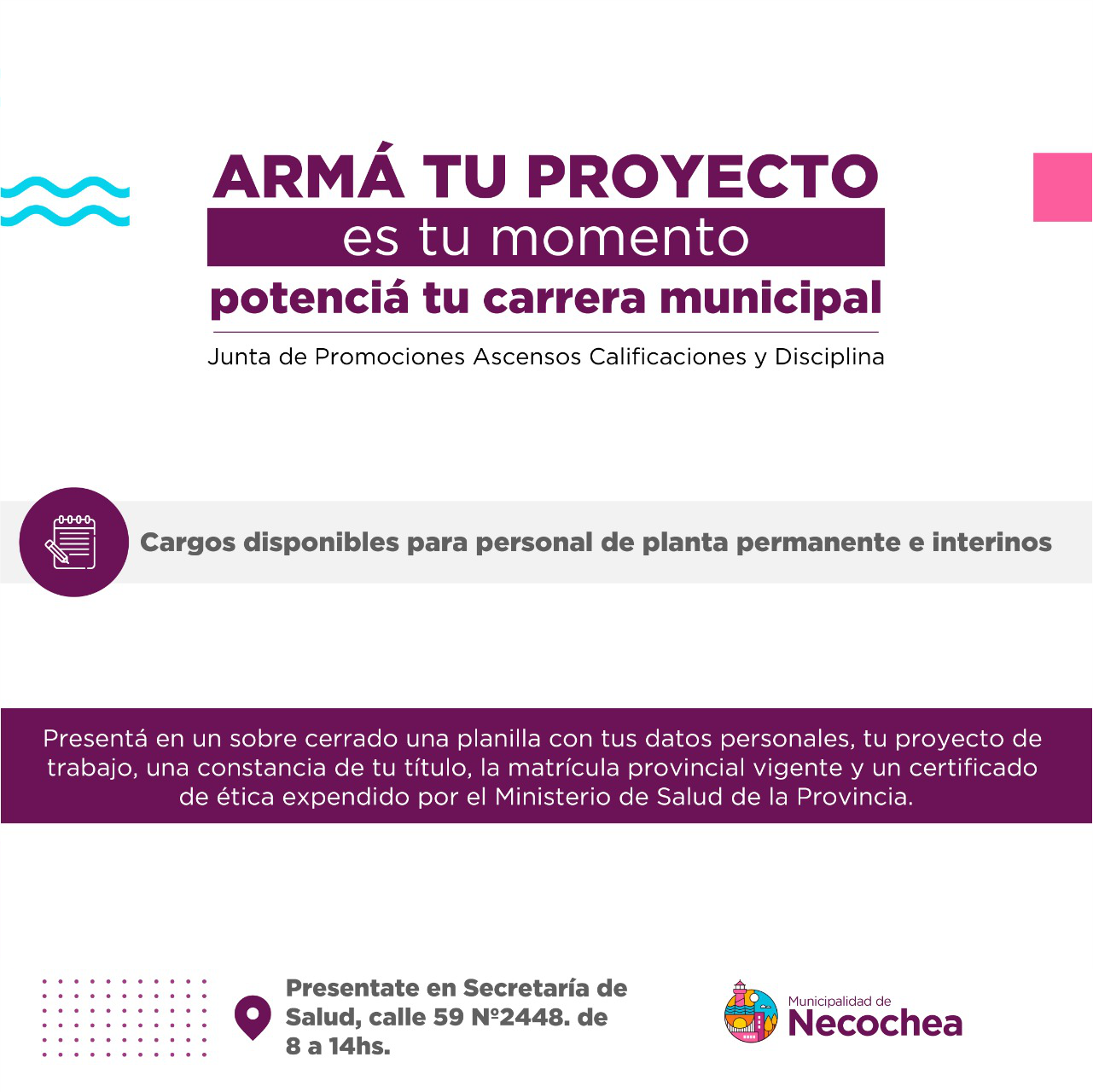 Conforme a lo resuelto por la Junta de Promociones, Ascenso, Calificaciones y Disciplina, el municipio informa que se ha proyectado el llamamiento a Concurso Interno en el área de Salud, correspondiente a las categorías superiores y/o con personal a cargo.