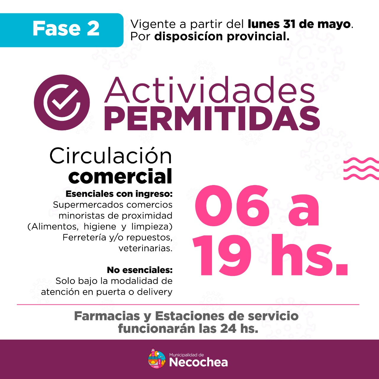 A partir de mañana lunes 31 de mayo, el Distrito de Necochea, por disposición del gobierno de la Provincia de Buenos Aires, en consonancia con lo establecido ante la cantidad de casos activos de Covid-19, pasa a Fase 2, lo que dispone cambios respecto a los horarios de las actividades comerciales, deportivas y sociales.