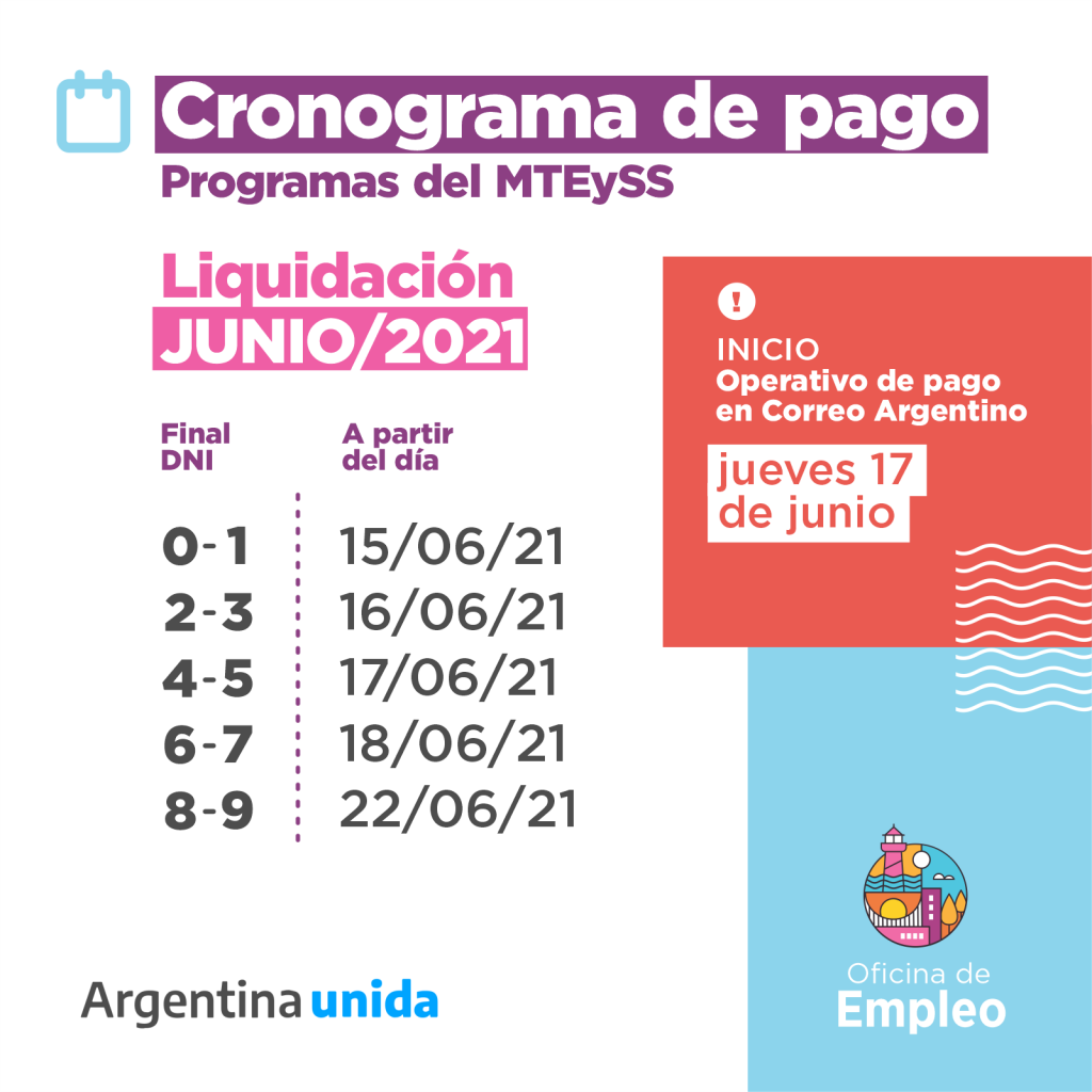 La Oficina de Empleo Municipal, área dependiente de la Secretaría de Planificación y Desarrollo Productivo, informa que este martes comenzará a ejecutarse el operativo de pago correspondiente a mayo, por las prestaciones de los programas del Ministerio de Trabajo, Empleo y Seguridad Social de la Nación.
