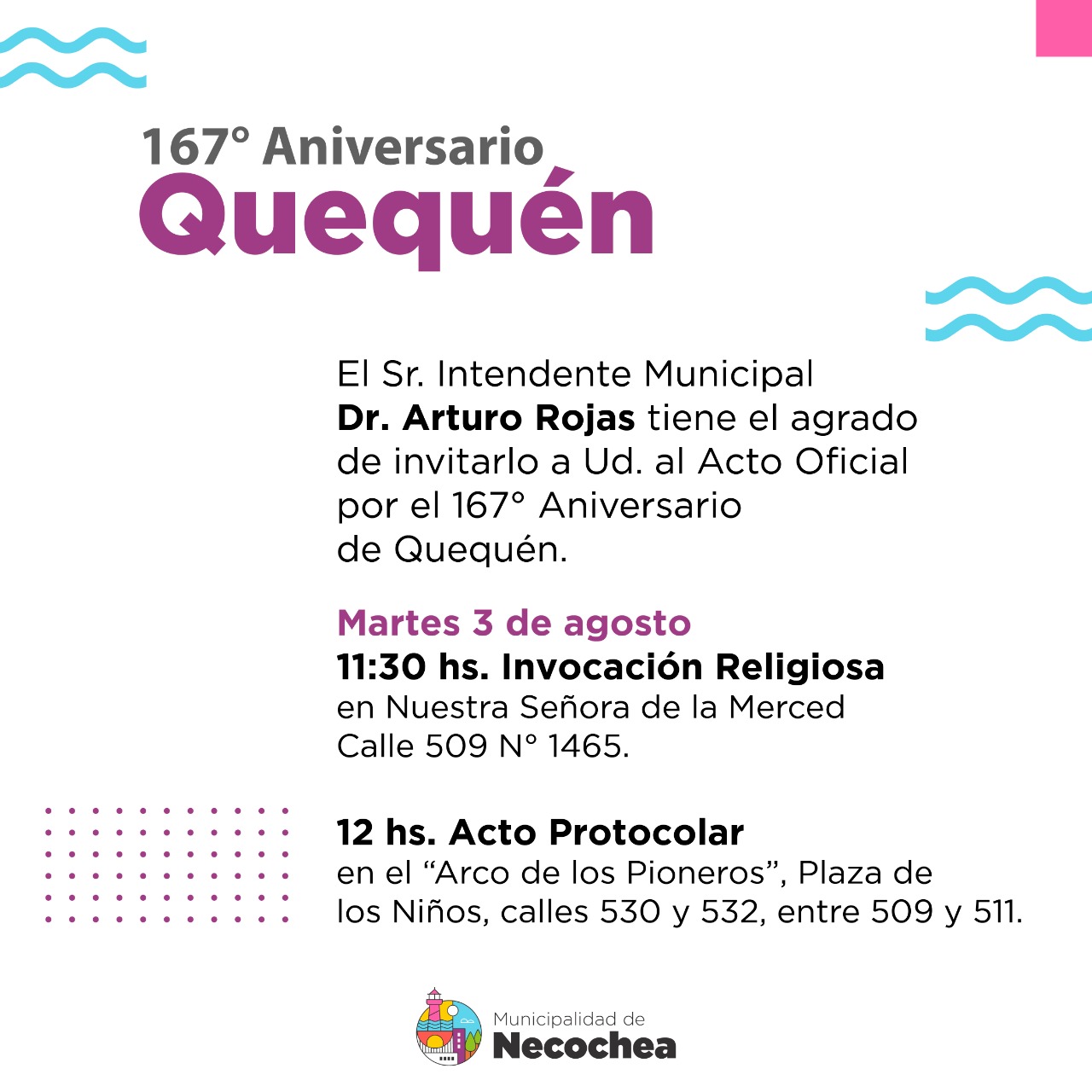 Este martes 3 de agosto, la localidad de Quequén estará celebrando su 167º Aniversario con un pequeño acto protocolar en el “Arco de los Pioneros” de la Plaza de los Niños, que será encabezado por el intendente Arturo Rojas y el delegado Bernardo Amilcar.