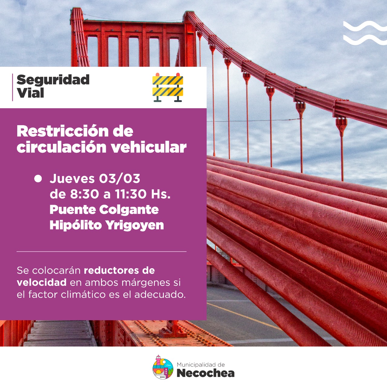 La Municipalidad de Necochea informa que este jueves 3 de marzo, en el segmento horario de 8.30 a 11.30 AM, se interrumpirá la circulación vehicular en el Puente Colgante “Hipólito Yrigoyen”, con motivo de realizar tareas de colocación de reductores de velocidad en ambas márgenes del mismo.