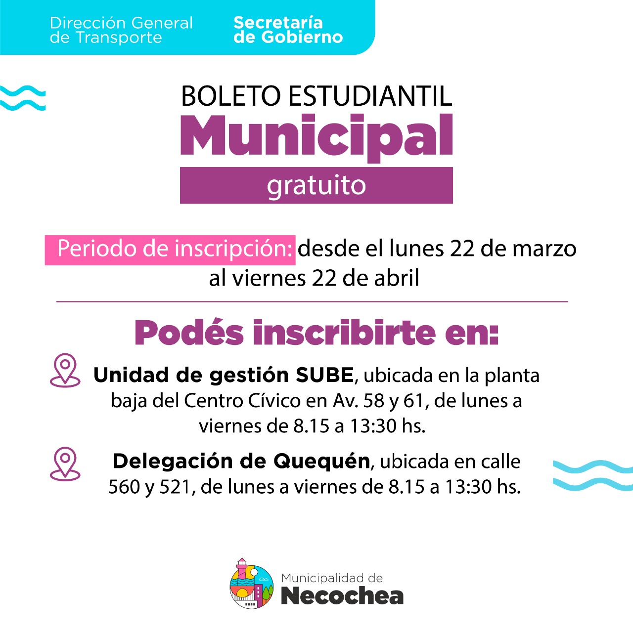 La Municipalidad de Necochea, desde la Dirección de Transporte a cargo de Facundo Croci, informa que a partir del lunes 21 de marzo, de 8:15 a 13:30 en el Centro Cívico de Av. 58 y 61 y en el mismo horario en la Delegación de Quequén (560 y 521), comienza la inscripción y renovación del programa Boleto Estudiantil Municipal Gratuito mediante el Sistema Único de Boleto Electrónico (SUBE), la cual se extenderá hasta el 22 de abril.