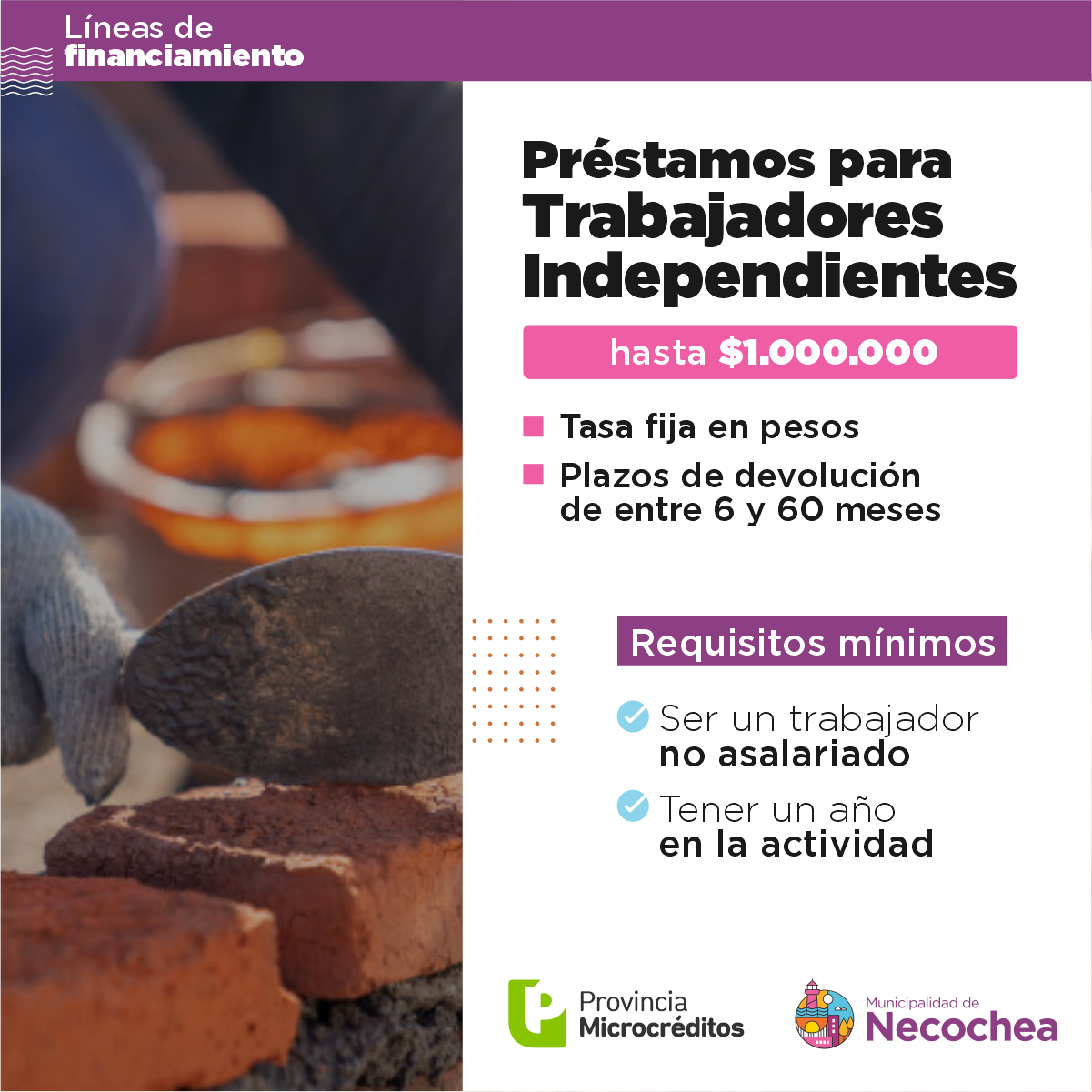 La Secretaría de Planificación y Desarrollo Productivo informa a los trabajadores independientes del distrito de Necochea que se encuentra abierta la línea de financiamiento de Provincia Microcréditos, destinada a la adquisición de capital de trabajo o inversión productiva.