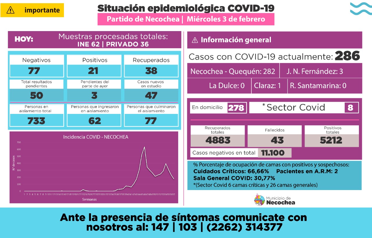 La Secretaría de Salud de la Municipalidad de Necochea emitió, hace momentos, un nuevo informe diario con todos los números que se desprenden de la actual situación epidemiológica en nuestro distrito, con el dato alentador de que los casos han caído por debajo de los 300, como no ocurría desde el pasado 15 de diciembre, cuando los detectados por la comuna fueron 295 en total.
