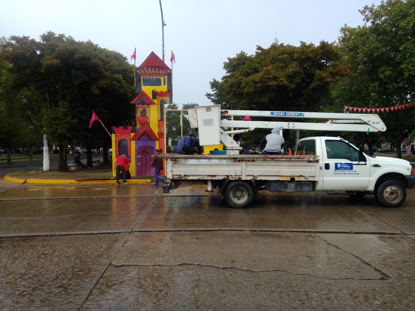 Debido a la gran cantidad de lluvia registrada durante el feriado largo, algunas de las estructuras montadas en la Plaza Dardo Rocha para la actividad del Festival Infantil se han visto dañadas, y desde el municipio se trabaja a contrarreloj para la presentación de mañana jueves a las 21.