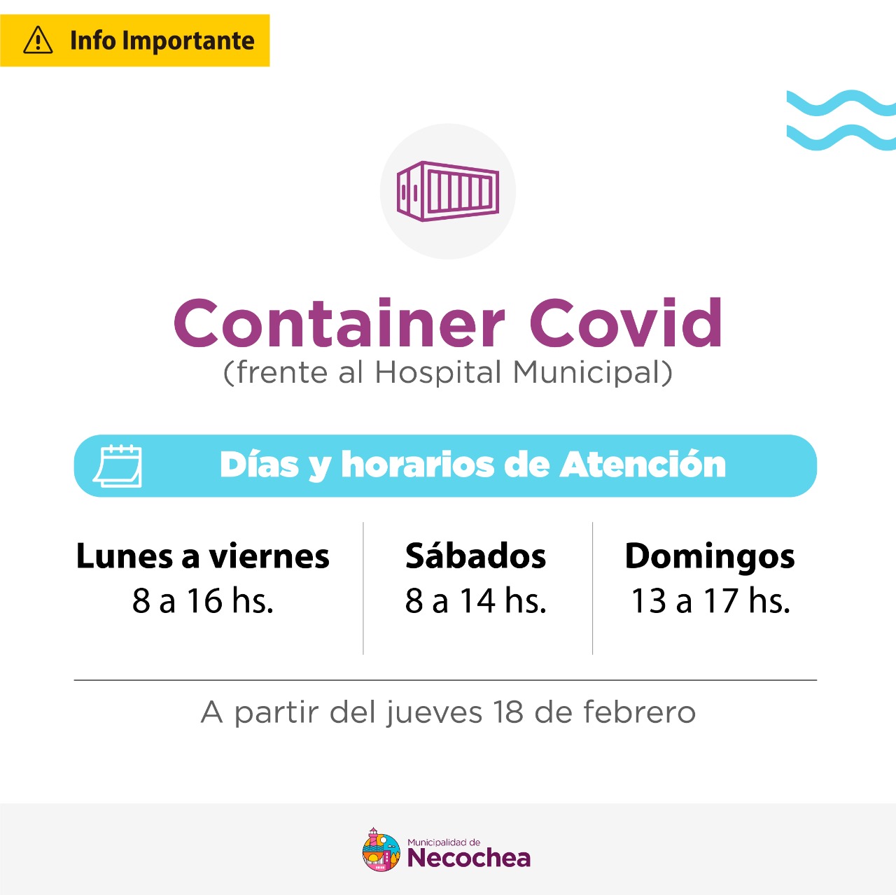 A partir del pasado jueves 18 de febrero, el container que el municipio utiliza para la atención de casos sospechosos de Covid-19, con funcionamiento frente al Hospital “Dr. Emilio Ferreyra”, cambió los horarios, según informaron desde la Secretaría de Salud.
