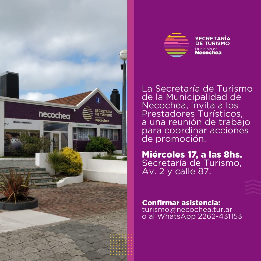 La Secretaría de Turismo, a cargo de Marcela García, invita a los prestadores turísticos de todo el distrito a participar en una reunión de trabajo que se realizará el próximo miércoles 17 de febrero, a las 8, en la sede la dependencia municipal, ubicada en Avenida 2 y 87.