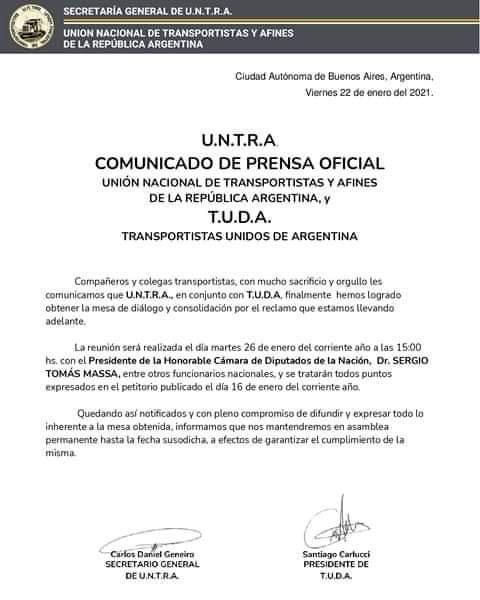 A través de un comunicado oficial de prensa, la Unión Nacional de Transportistas y Afines de la República Argentina (UNTRA) y los Transportistas Unidos de Argentina (TUDA) informaron que, “con mucho sacrificio y orgullo”, consiguieron conformar una mesa de diálogo y consolidación por el reclamo que llevan adelante.