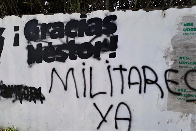 "Cobardemente escracharon los mismos y pintaron leyendas reivindicativas de épocas negras de nuestra historia", señala el escrito sobre este acto. En las imágenes que fueron cedidas por la propia organización política se puede ver tachado un graffiti con la cara de Diego Maradona o leerse consignas del estilo "Militares ya".